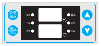 2、設(shè)置參數(shù)模式:電源接通后,抽濕裝置自檢通過后,自動進入自動模式,雙層數(shù)碼顯示當(dāng)前的濕度值和溫度值。按“設(shè)置/退出”鍵可設(shè)置除濕啟動值、除濕斷開值、加熱啟動值以及無線通訊地址。